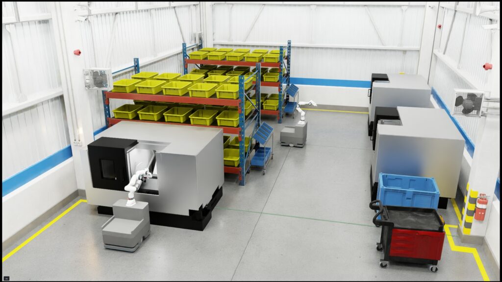 Isaac Simによる仮想工場と作業ロボットの例。これを研修にも活用します。